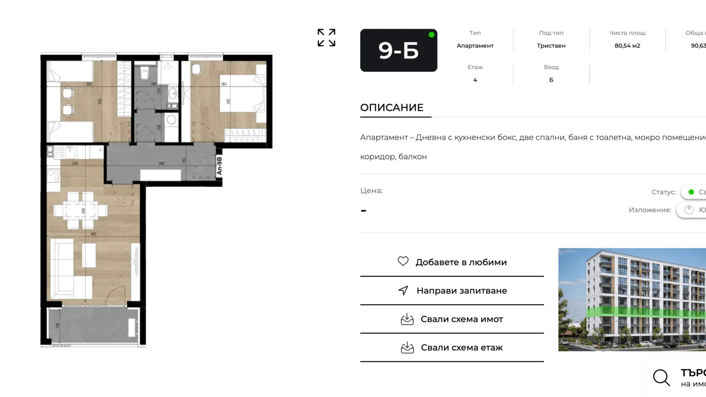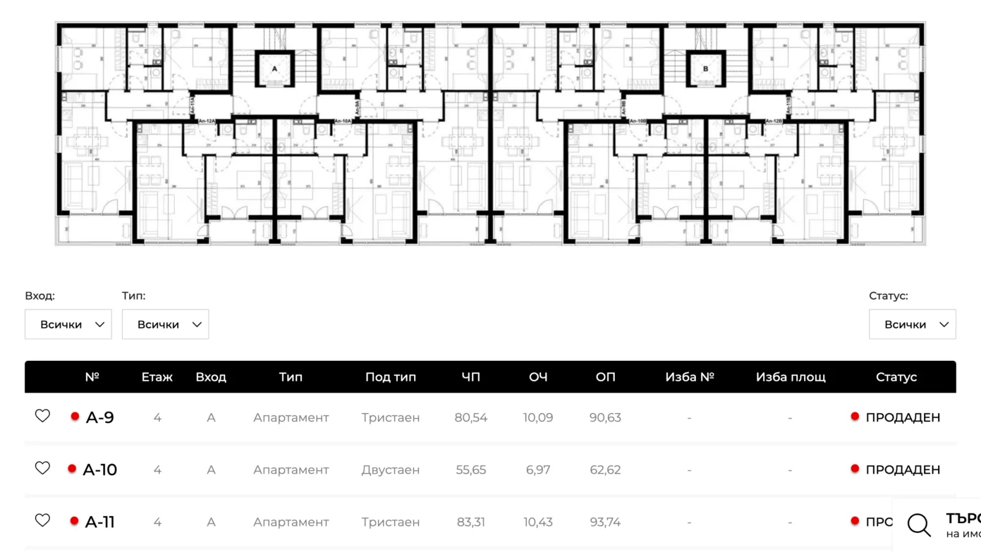 За всяка сграда беше разработено активно разпределение, което позволява общо разглеждане на обектите, избор на конкретна секция, етаж или апартамент.