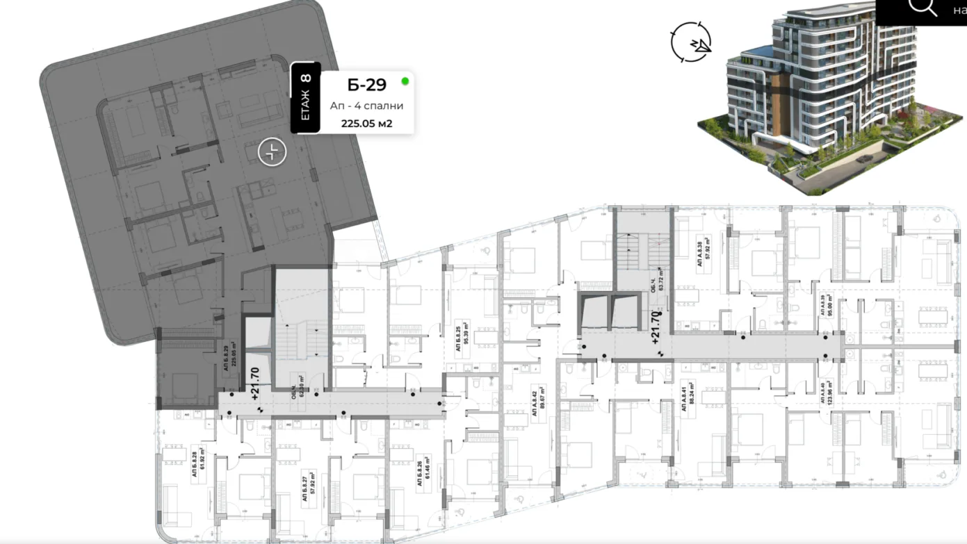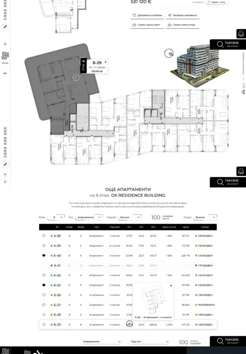 В нашия иновативен подход създадохме интерактивни карти на сградите, етажите и апартаментите. Клиентите имат възможност да изследват различните нива, да разберат разпределението и да се ориентират в пространствата, които Ox Residence предлага. Тази ценна функция дава възможност на купувачите да разгледат и визуализират своето бъдещо жилище в детайли.