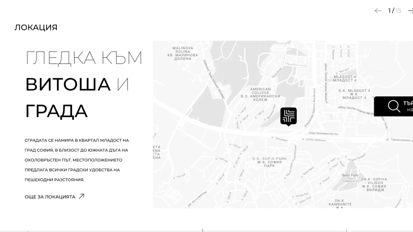 Вниманието към детайлите не спира тук. В уебсайта интегрирахме информация за над 300 близки локации, включително детски градини, аптеки, метростанции и други важни точки, които са от съществено значение за ежедневието на живущите. За всяка локация предоставихме информация за разстоянието до нея и времето за достигане пеша или с автомобил. Тази функционалност не само улеснява клиентите да разберат инфраструктурата на района, но и подчертава стратегическото местоположение на комплекса.