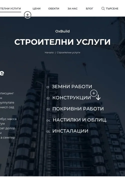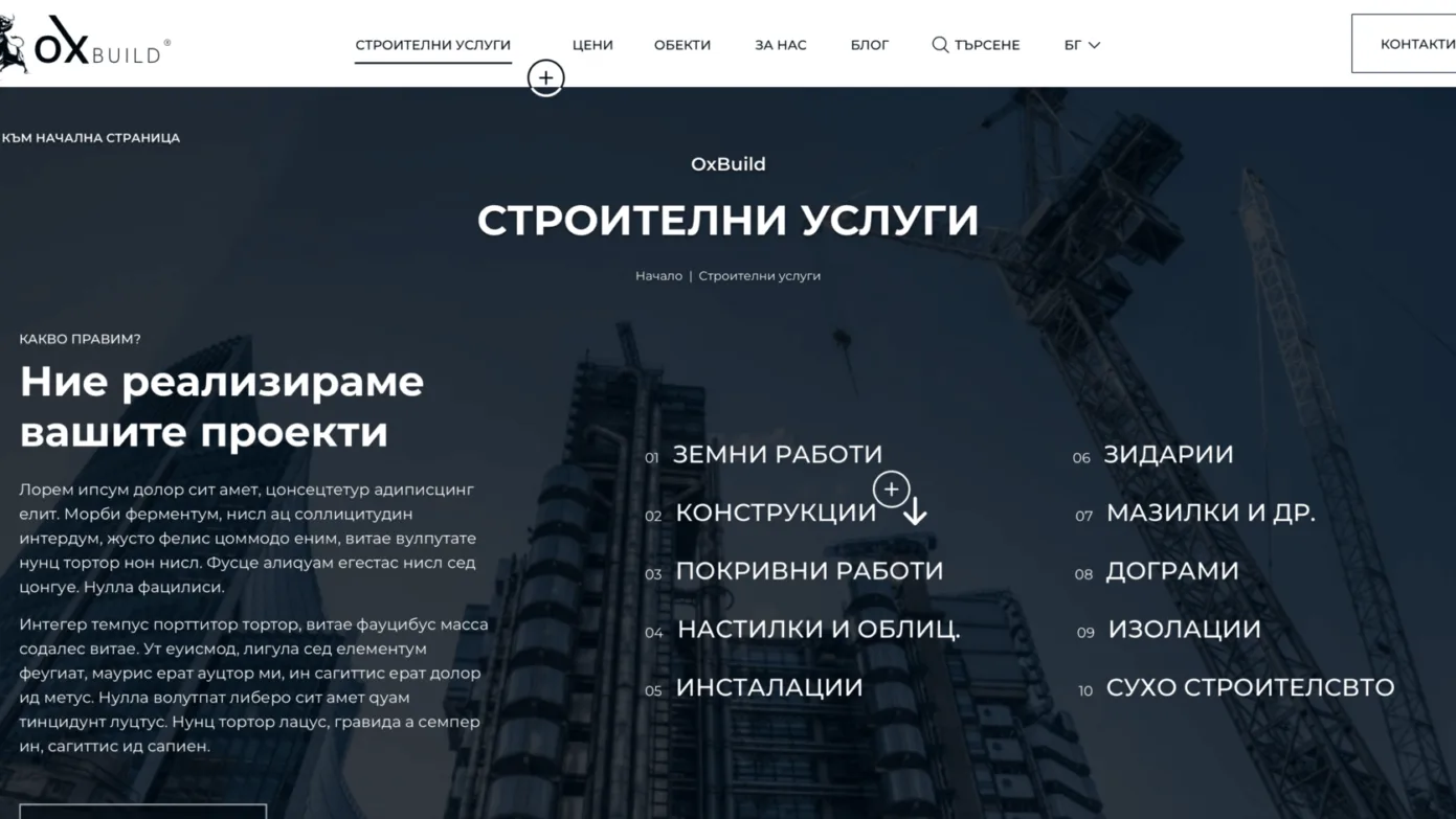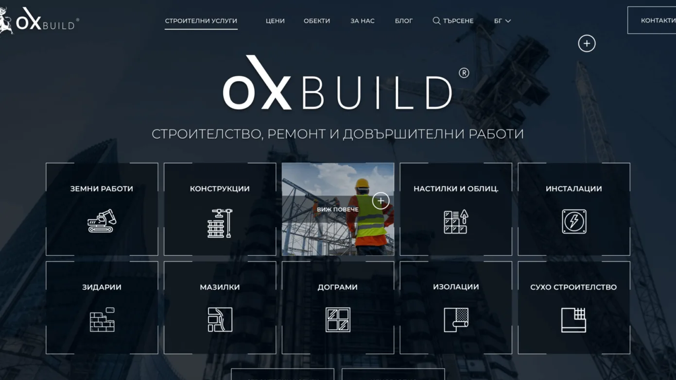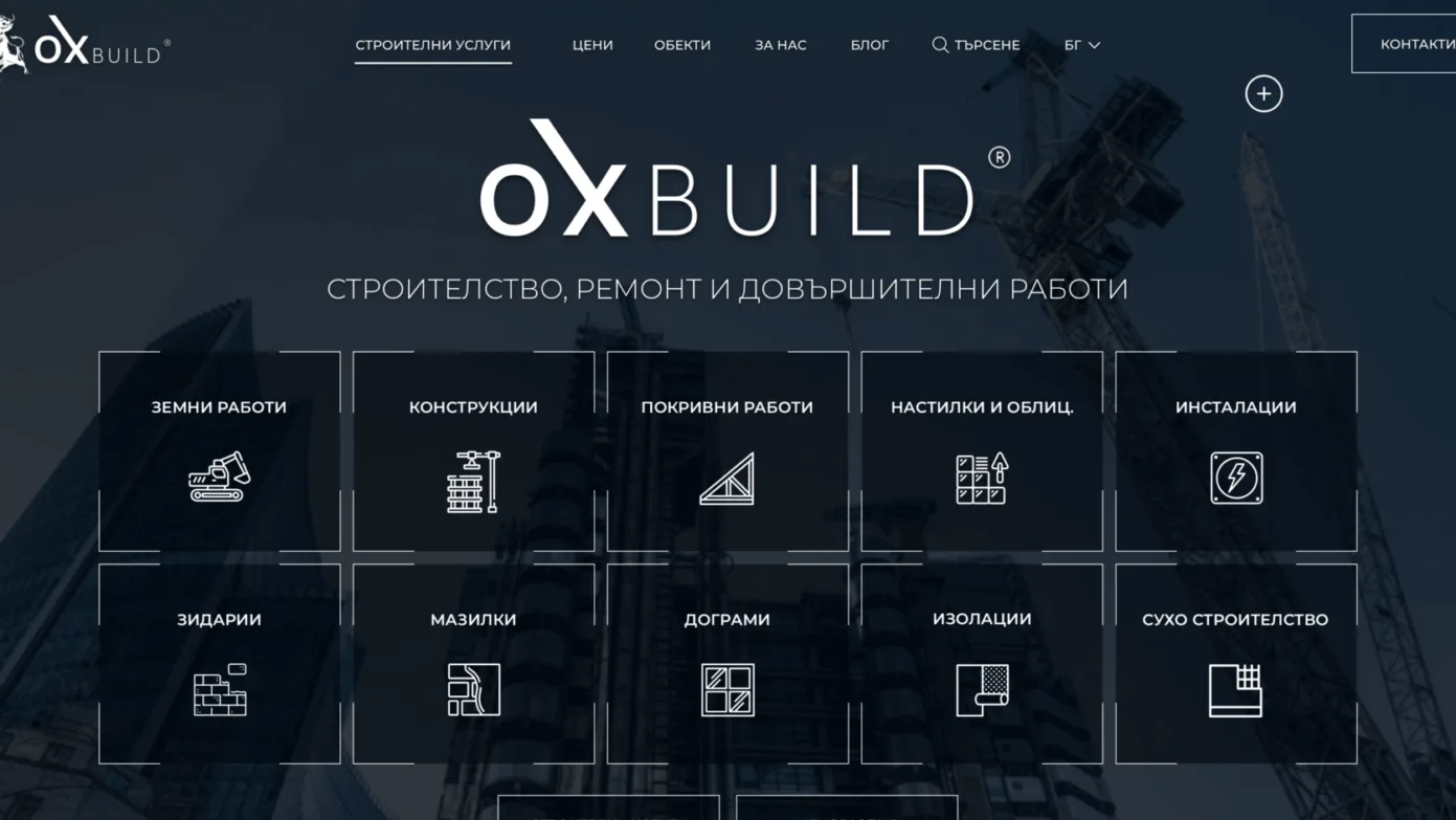OXBUILD е една от успешните компании със свързана дейност, които формират мащабен холдинг. Има над 20 годишен опит в областта на строителството и всички свързани с него допълнителни услуги. Компанията се развива еднакво успешно като строителен инвеститор и доставчик на услуги и материали през годините. Предлага широко разнообразие от услуги, които позволяват на купувачите на нови жилища да се насладят на новия си завършен дом, без стреса на довършителните дейности и ремонтите. OXBUILD ни възложи изработката на сложен като конструкция и фокус на вниманието корпоративен уеб сайт.