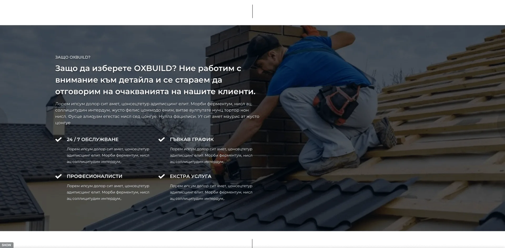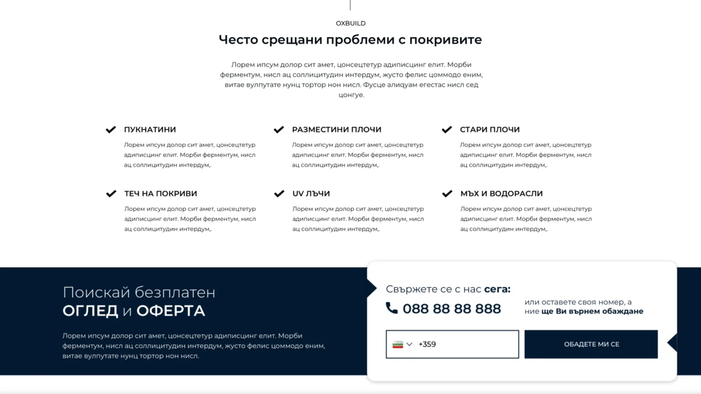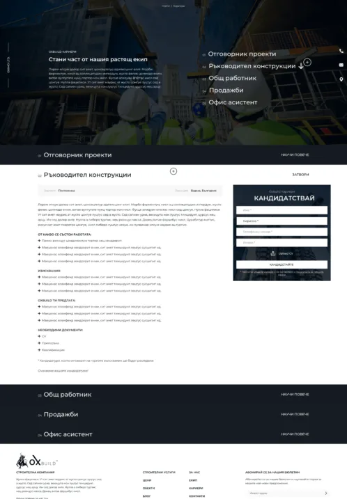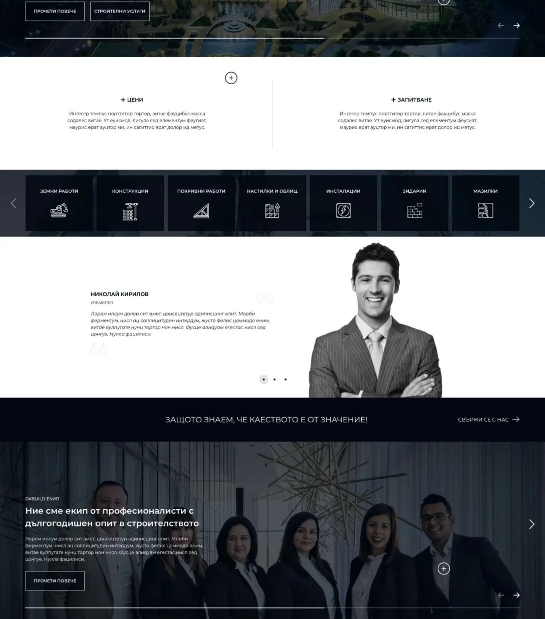 OXBUILD е една от успешните компании със свързана дейност, които формират мащабен холдинг. Има над 20 годишен опит в областта на строителството и всички свързани с него допълнителни услуги. Компанията се развива еднакво успешно като строителен инвеститор и доставчик на услуги и материали през годините. Предлага широко разнообразие от услуги, които позволяват на купувачите на нови жилища да се насладят на новия си завършен дом, без стреса на довършителните дейности и ремонтите. OXBUILD ни възложи изработката на сложен като конструкция и фокус на вниманието корпоративен уеб сайт.