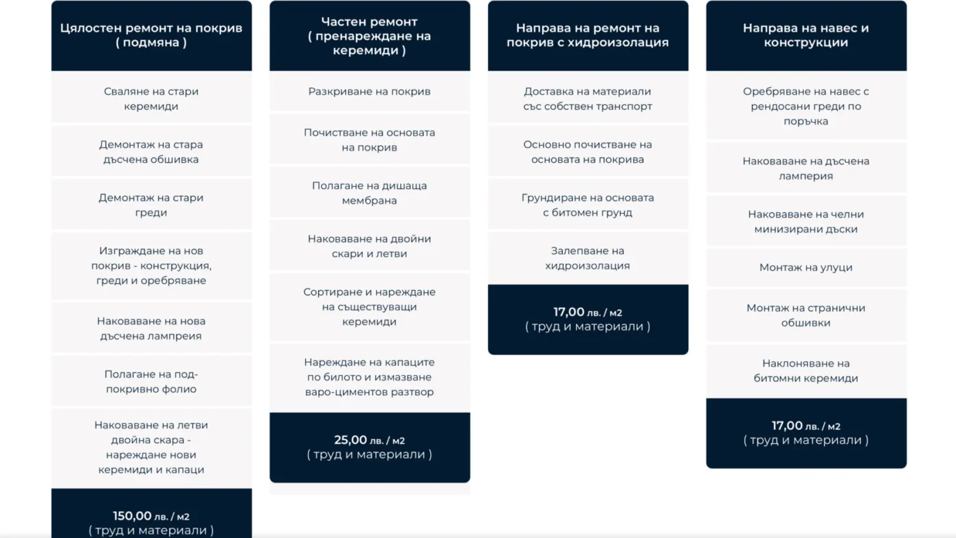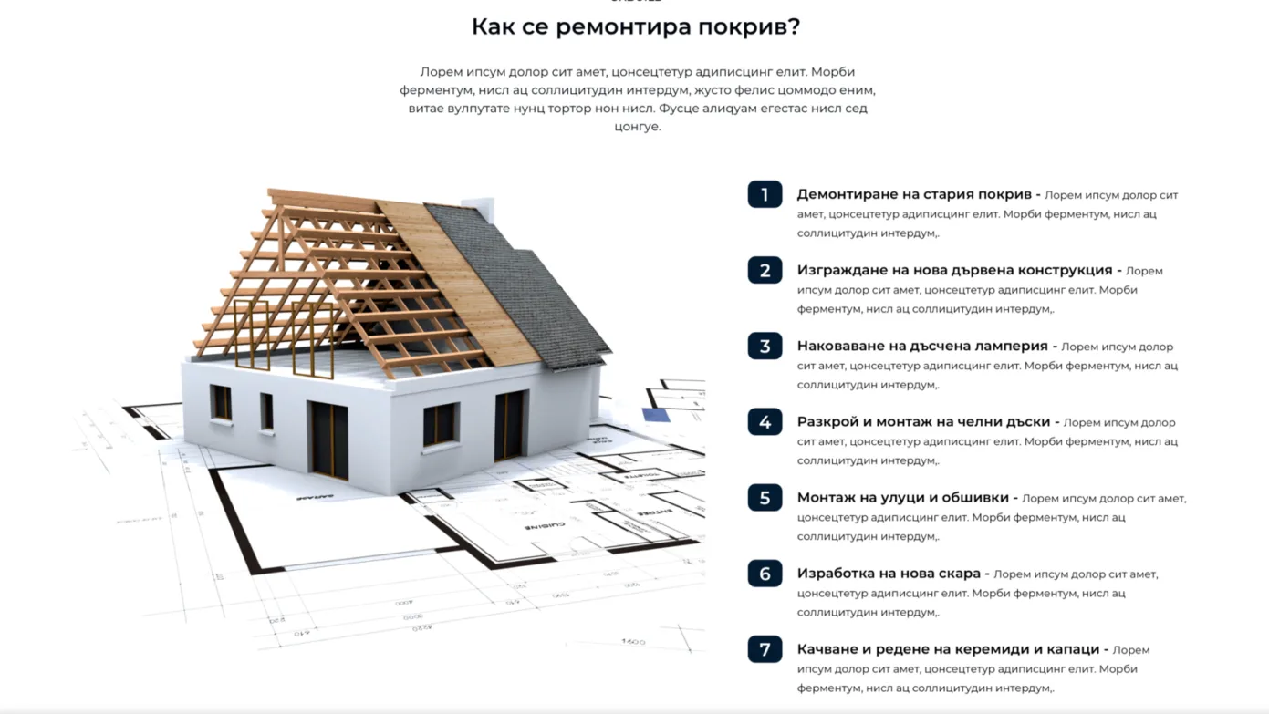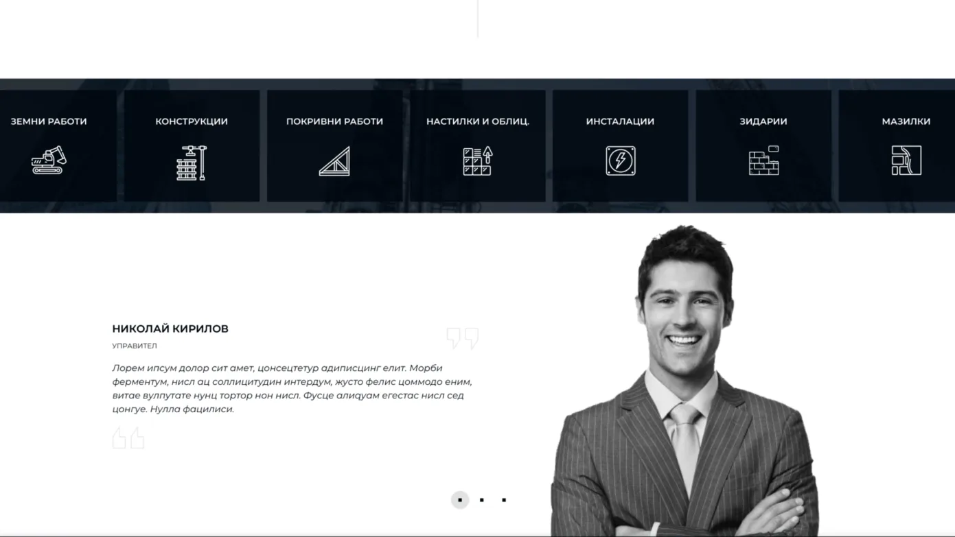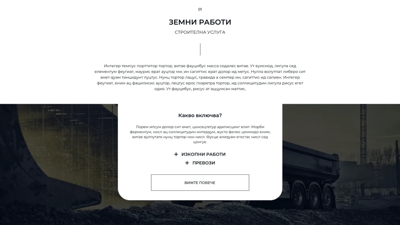 Началната страница съдържа последователност от информативни секции и препратки към различните дейности, услуги, корпоративна история, портфолио от завършени обекти, новини и други.