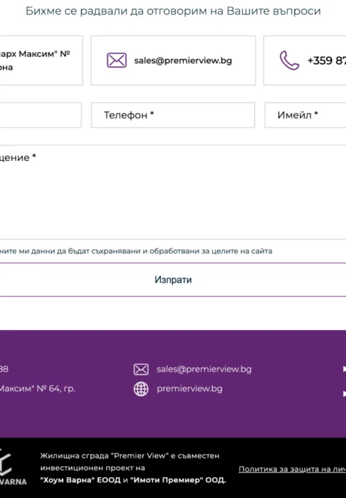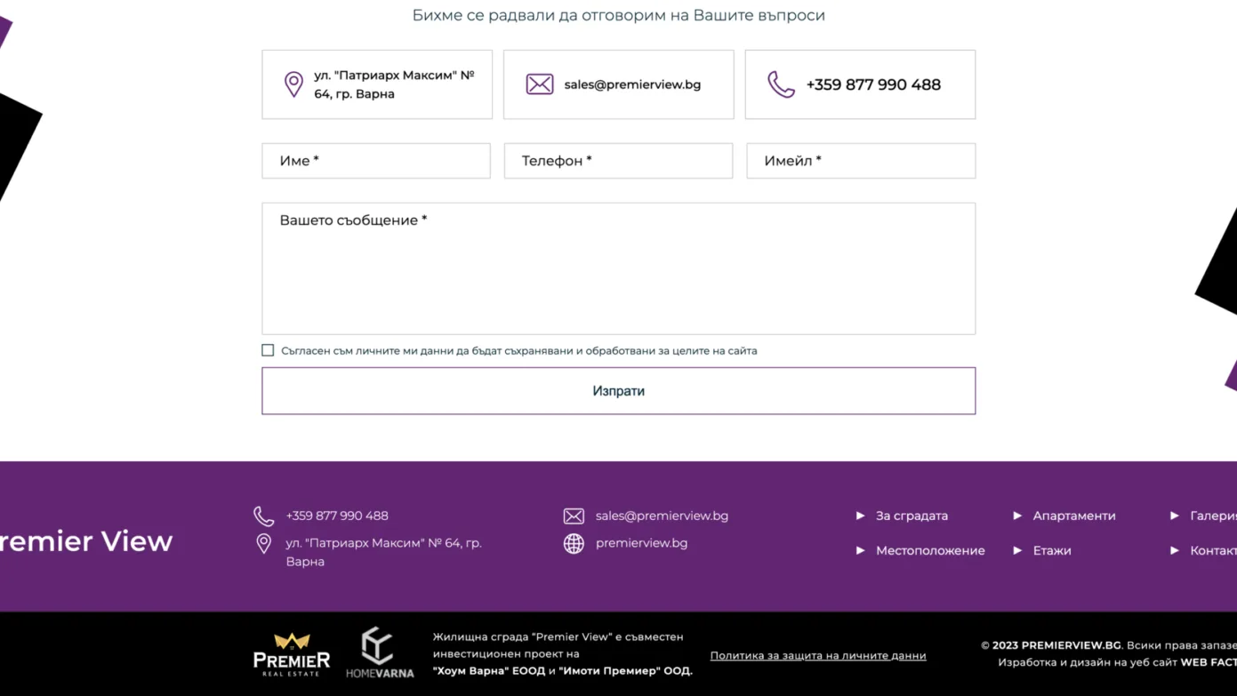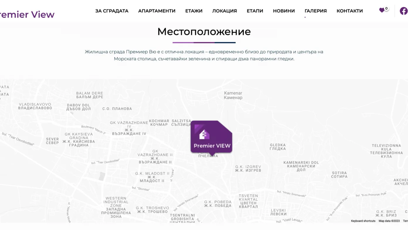 Premier View е общ инвестиционен проект на компаниите „Хоум Варна“ ЕООД и „Имоти Премиер“ ООД. Тази информация е напълно достатъчна за всеки потенциален клиент, за да бъде сигурен, че това е проект с огромен потенциал. Инвестиционните компании разполагат с дългогодишен опит в сферата на недвижимите и имоти и строителството. За осъществяването на жилищна сграда Premier View, те са разработили проект с фокус и към най-минималните детайли. Той със сигурност притежава всички необходими предпоставки да осигури на бъдещите си обитатели необходимите условия за комфортен и функционален комфорт. Инвеститорите ни възложиха разработка на сайт с комплексно присъствие в дигиталното пространство.