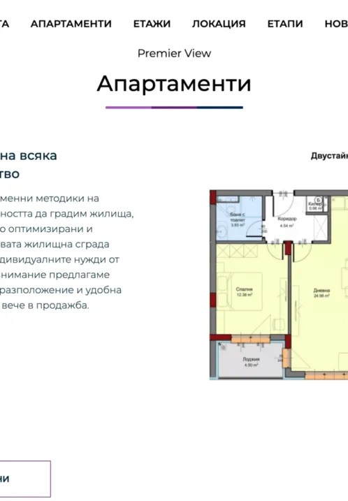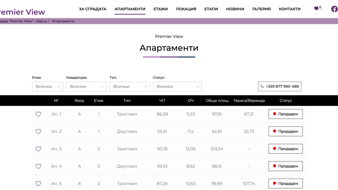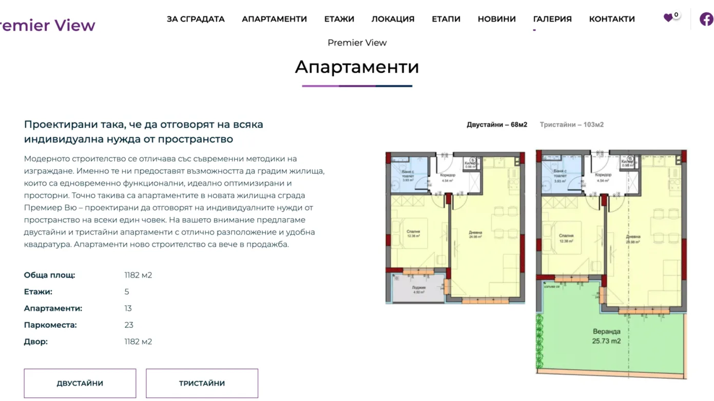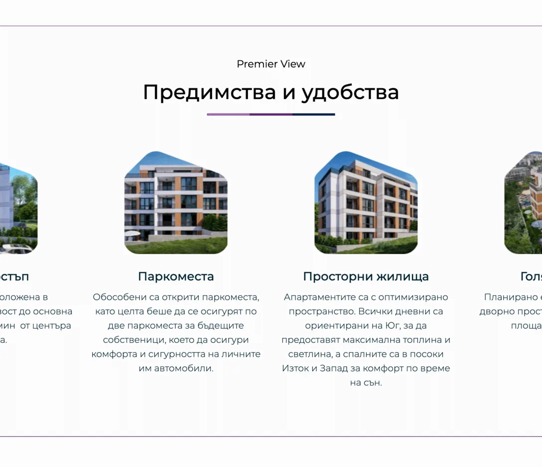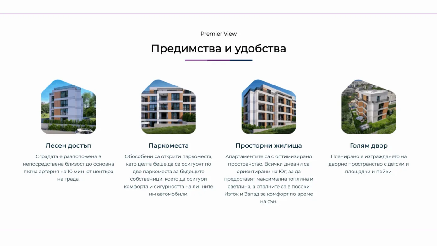 За да бъде успешен и популярен уеб сайтът на Premier View беше разработен с начална страница с максимален брой привличащи вниманието елементи. Тя е комплекс от информация за характеристиките и предимствата на сградата, както и видовете жилище с таблица за наличностите.