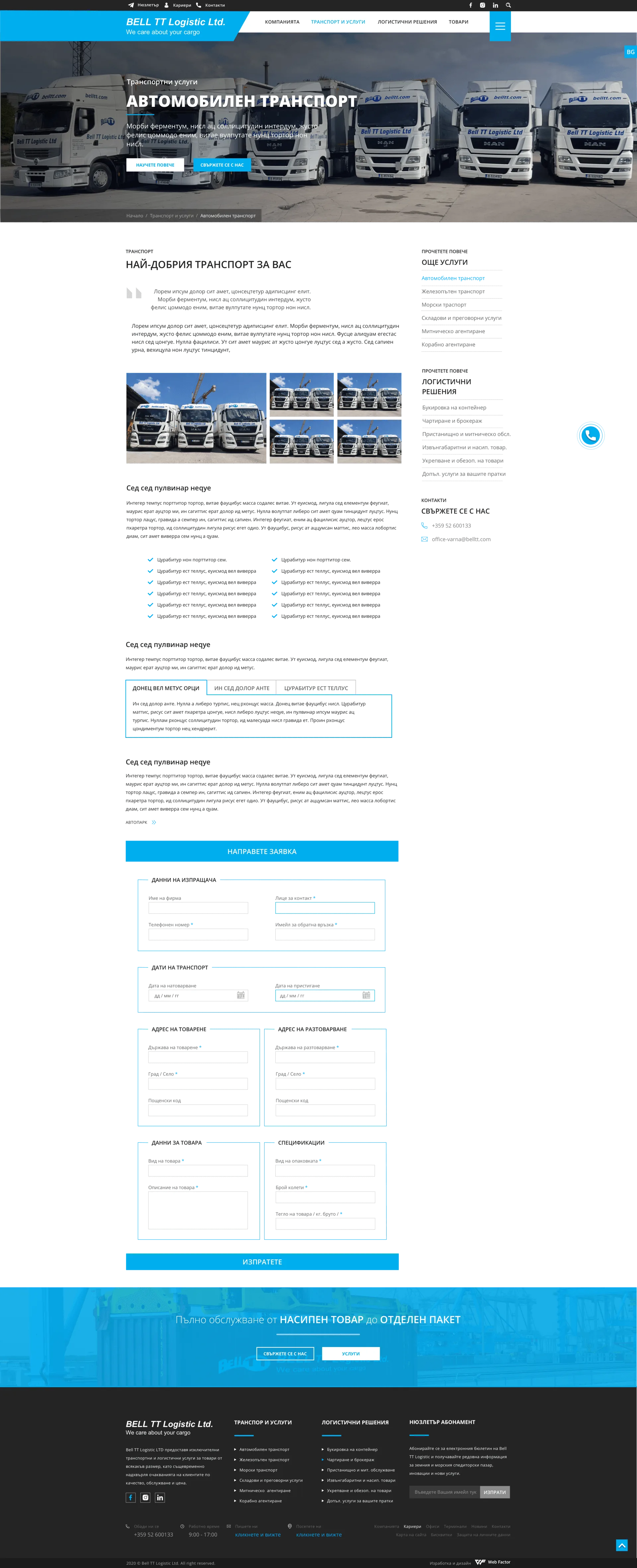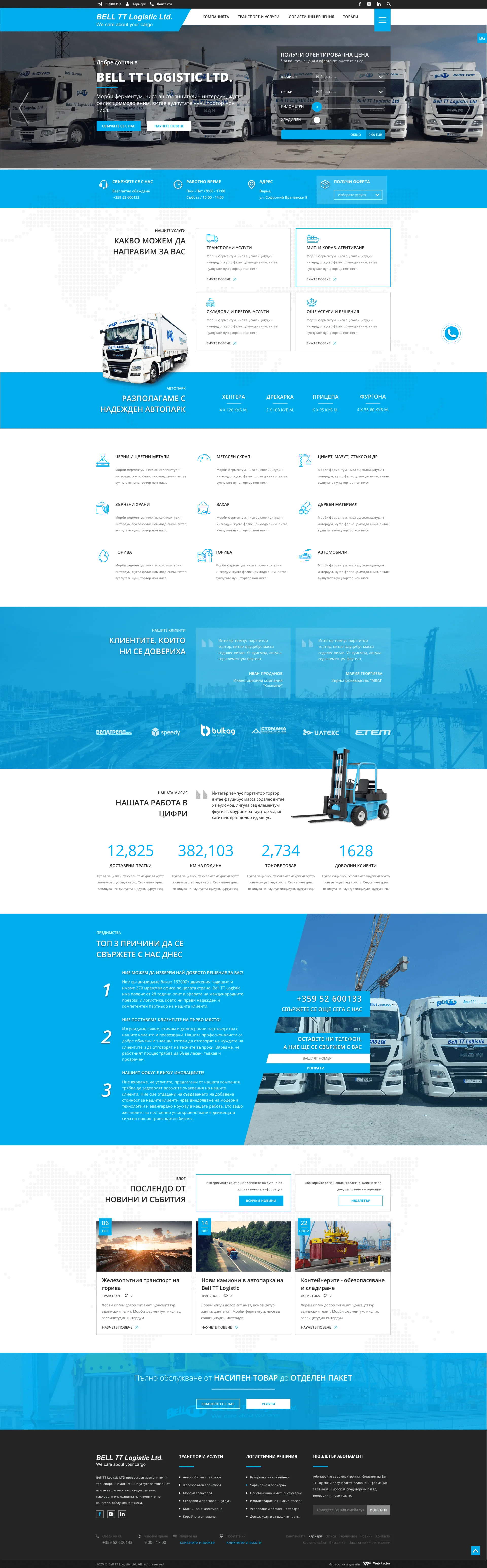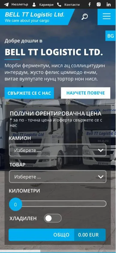 BellTT: Логистични Решения, Представени с Визия и Иновация С над 20 години опит в логистиката, BellTT е символ на надеждност и ефективност. Новият им уебсайт е проектиран с модерен подход, за да представи пълния спектър от услуги, които компанията предлага. Всяка секция е внимателно структурирана, за да улесни клиентите в намирането на информацията, от която се нуждаят. Сайтът се откроява като един от най-модерните в сферата, със стилен дизайн и функционалност, които подчертават професионализма на BellTT. Технологичните решения, интегрирани в платформата, гарантират лесна навигация и безпроблемен достъп до услугите на компанията. Ако и вашата фирма се нуждае от уебсайт, който да отразява вашия опит и лидерска позиция в индустрията, ние сме тук, за да го създадем. Свържете се с нас, за да реализираме вашата визия!