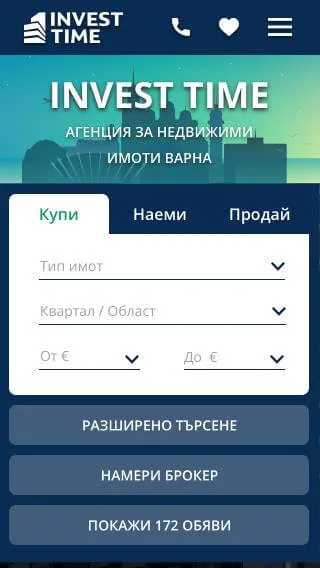 Изграждането на уебсайта на Invest Time има за цел да направи вашето търсене на жилище лесно и приятно. За да се грижим за вашето удобство, представяме атрактивен дизайн, който подобрява потребителското изживяване и ви потапя в света на недвижимите имоти. Тук ще намерите подходящ имот, ще продадете жилище или ще наемете апартамент.