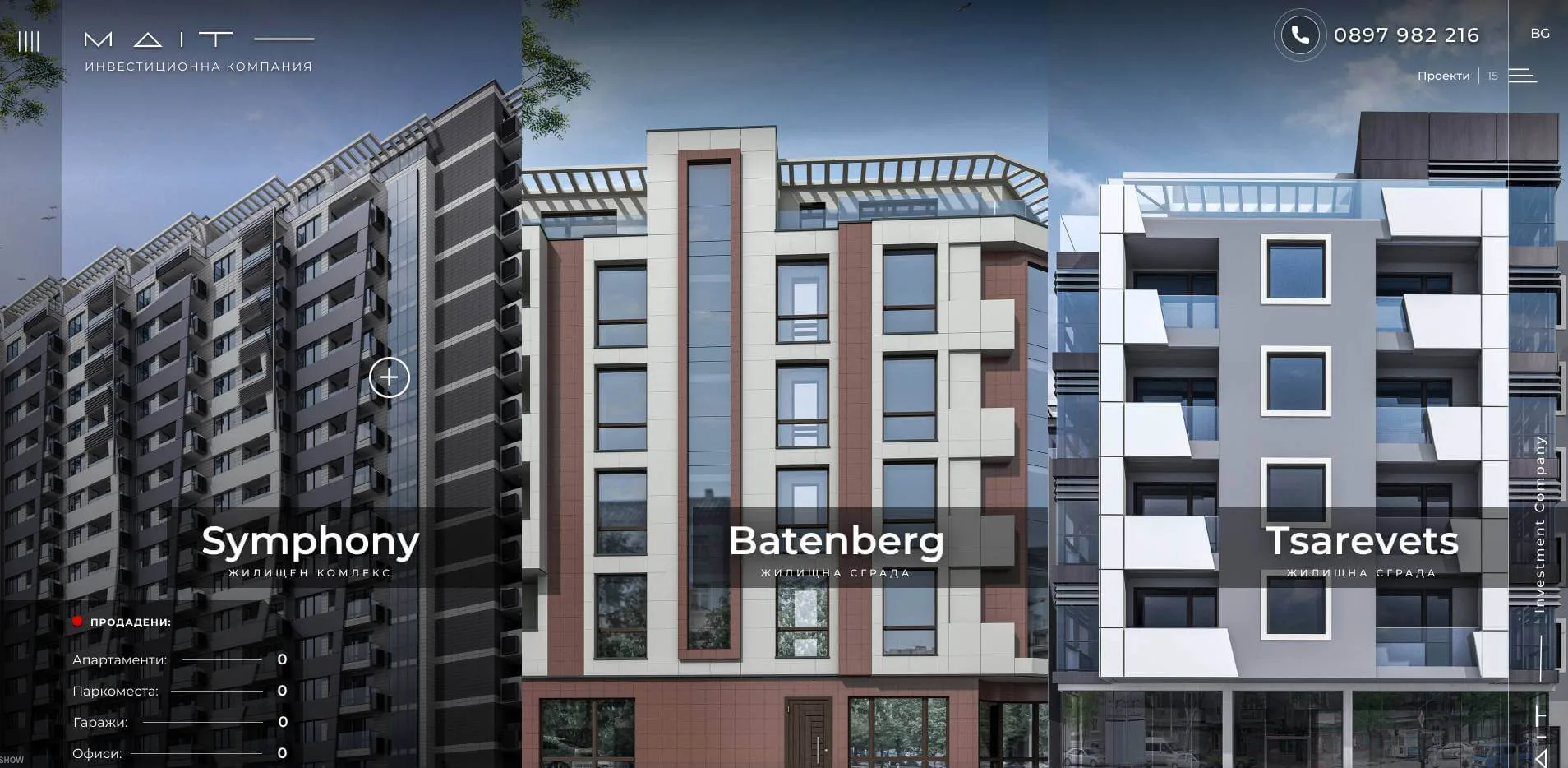 В уеб сайта получавате възможност да разгледате текущи проекти и да намерите свободните обекти в продажба. Чрез нашата интерактивна карта на сградите, можете лесно да разгледате характеристиките и разположението на апартаментите и паркоместата в продажба. С инвестиционна компания Майт можете да откриете вашето мечтано жилище.
